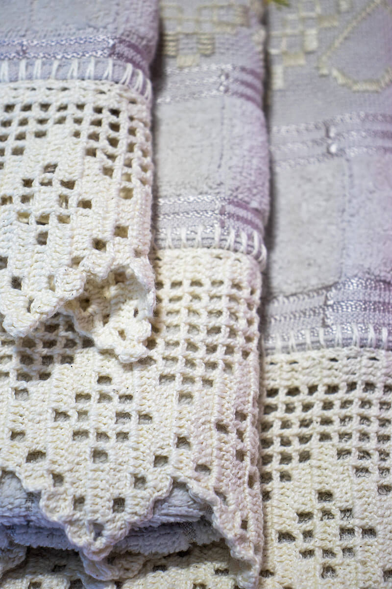 Conjunto de toalhas de banho, rosto e mão, com bordados finos e lindo barrado de crochê.