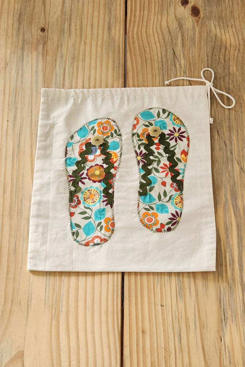 Porta Chinelos confeccionado em algodão cru, com aplique de tricoline estampado e fechamento com cordão de algodão.
