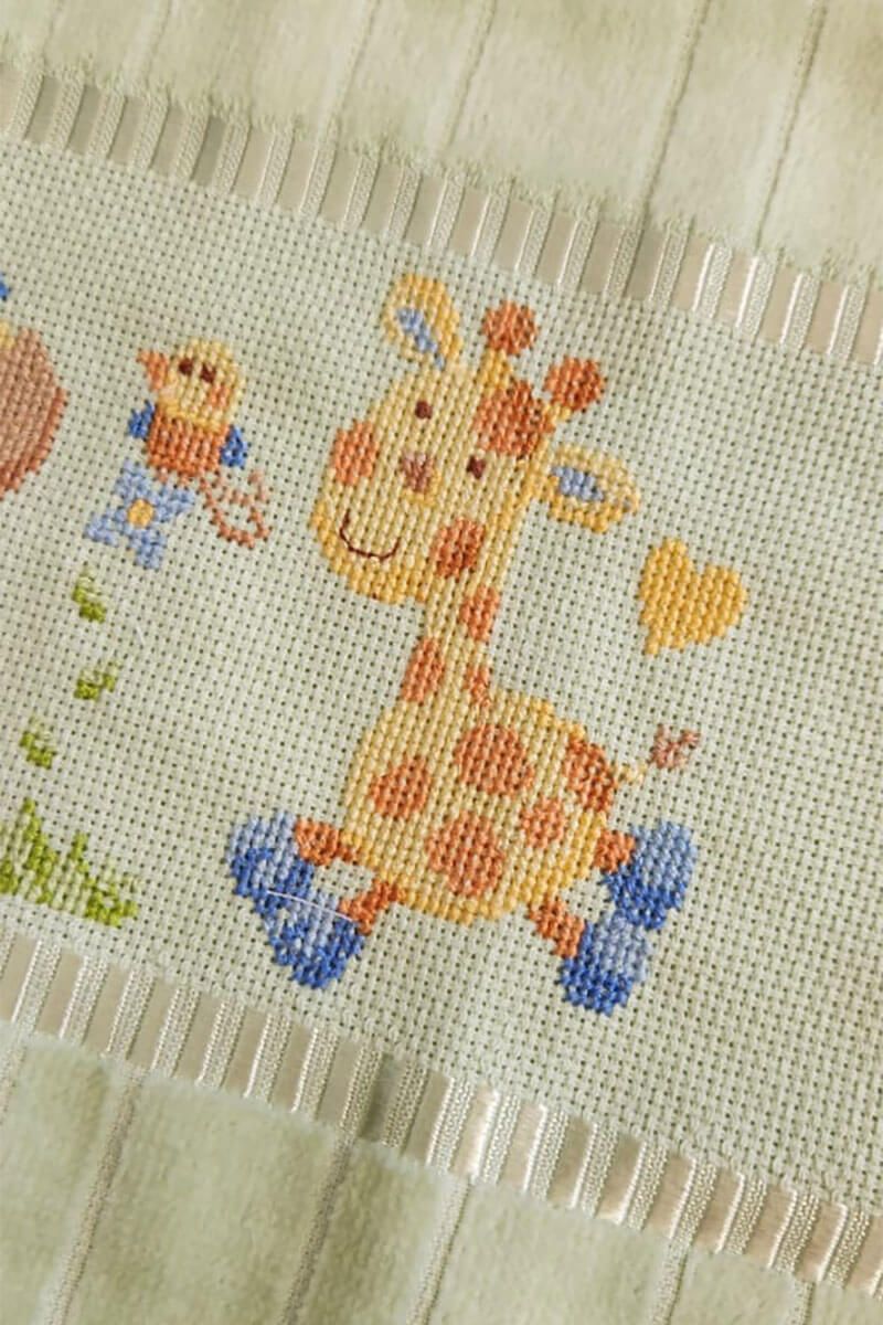 Toalha de mão aveludada, bordada em ponto cruz com desenhos divertidos, com barrado de crochê.